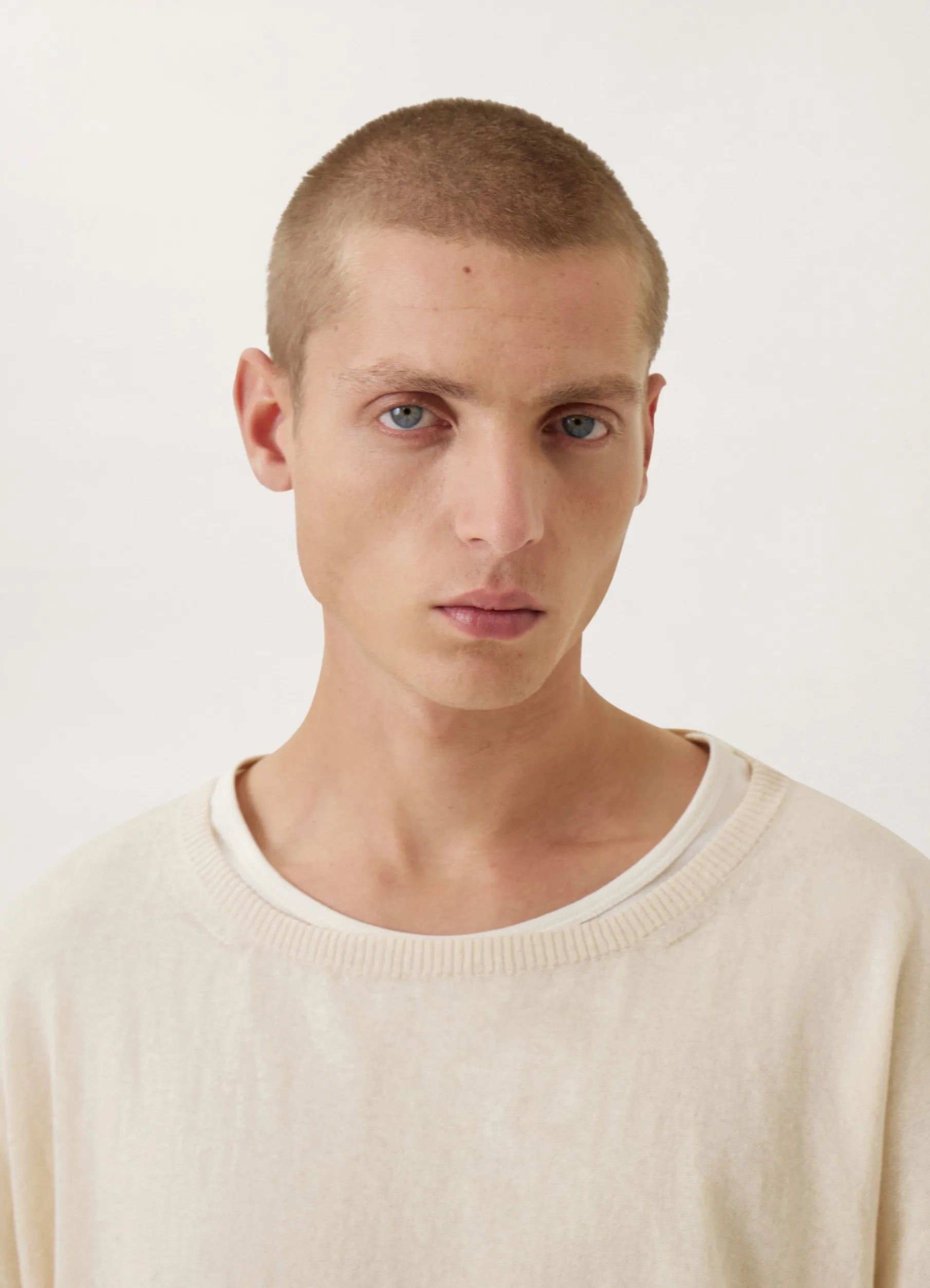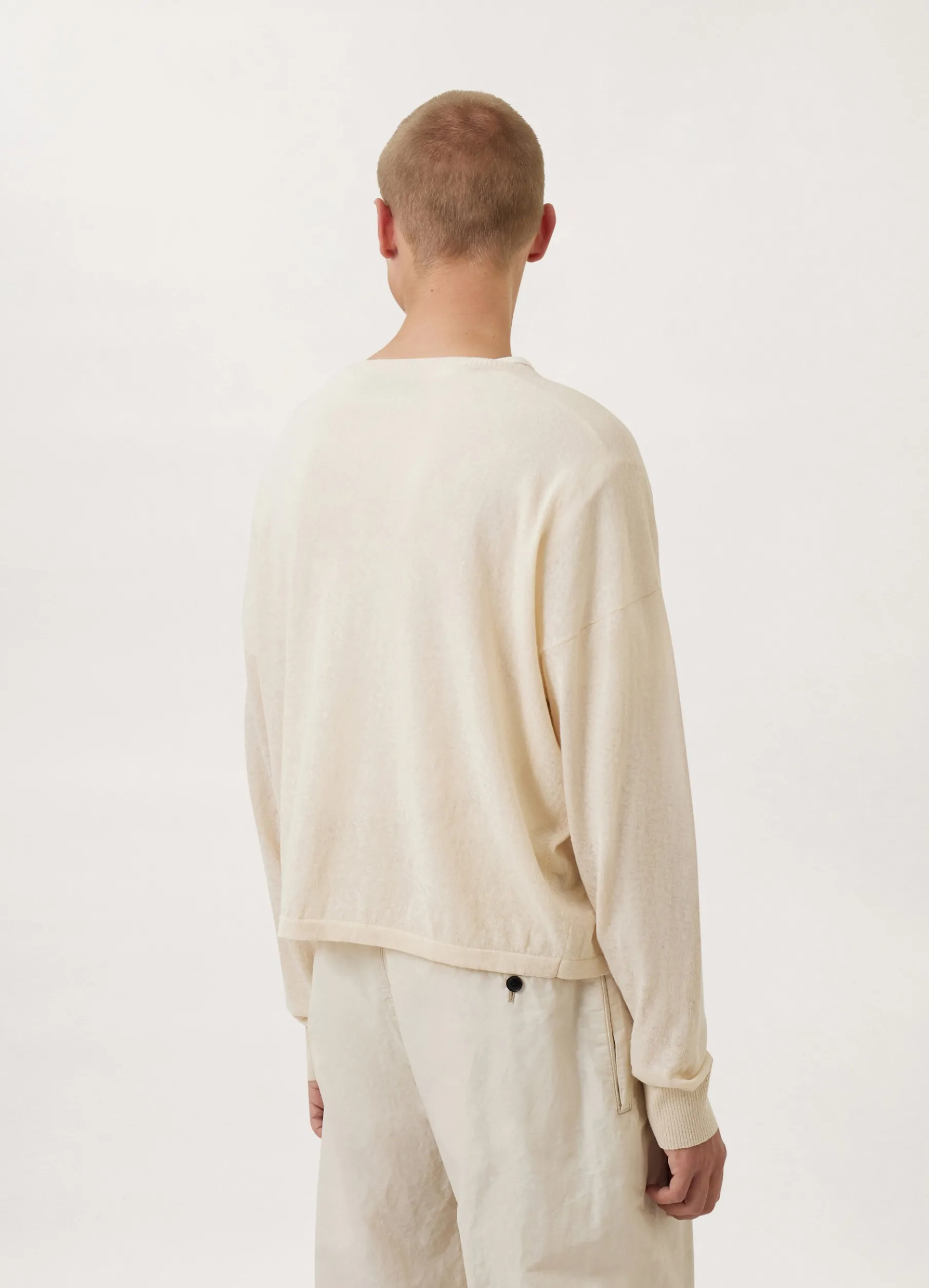 This Sweater Is Made Of A Fine Cotton Linen Blend With An Irregular Texture That Is Slightly Transparent. Its Proportions Are Boxy And Slightly Cropped, With A High And Flat Boatlike Neck And Dropped Shoulders. Tubular Rib Finishes The Collar, Cuffs And Hem.