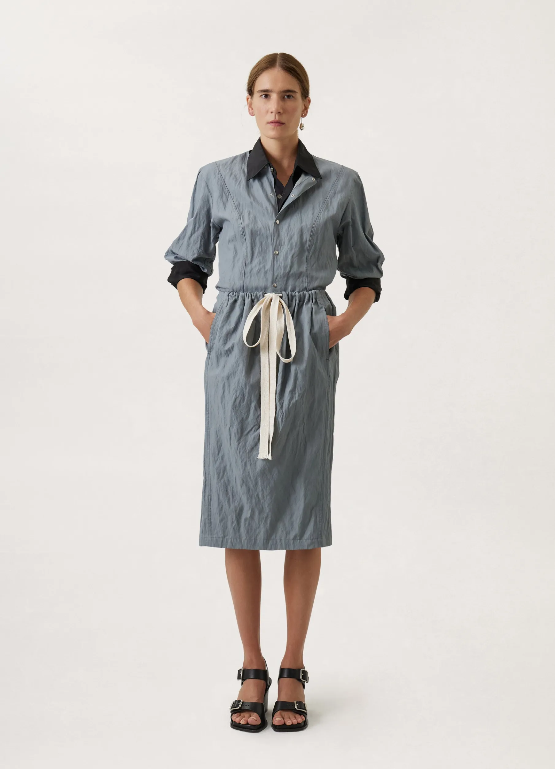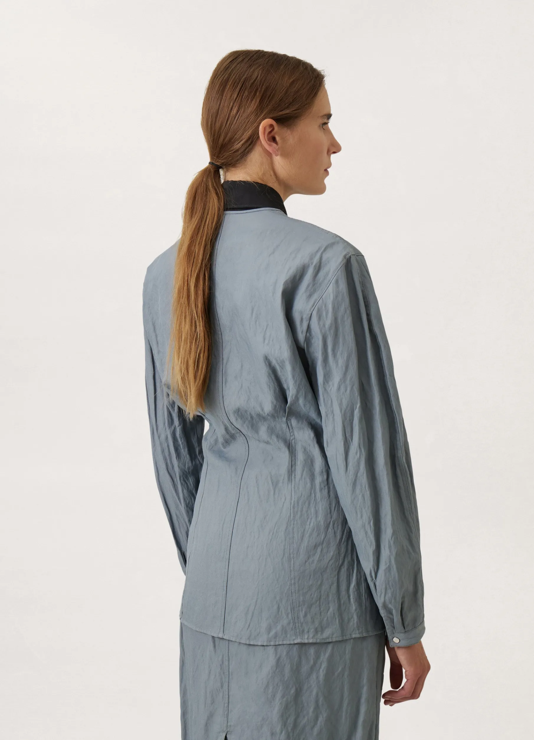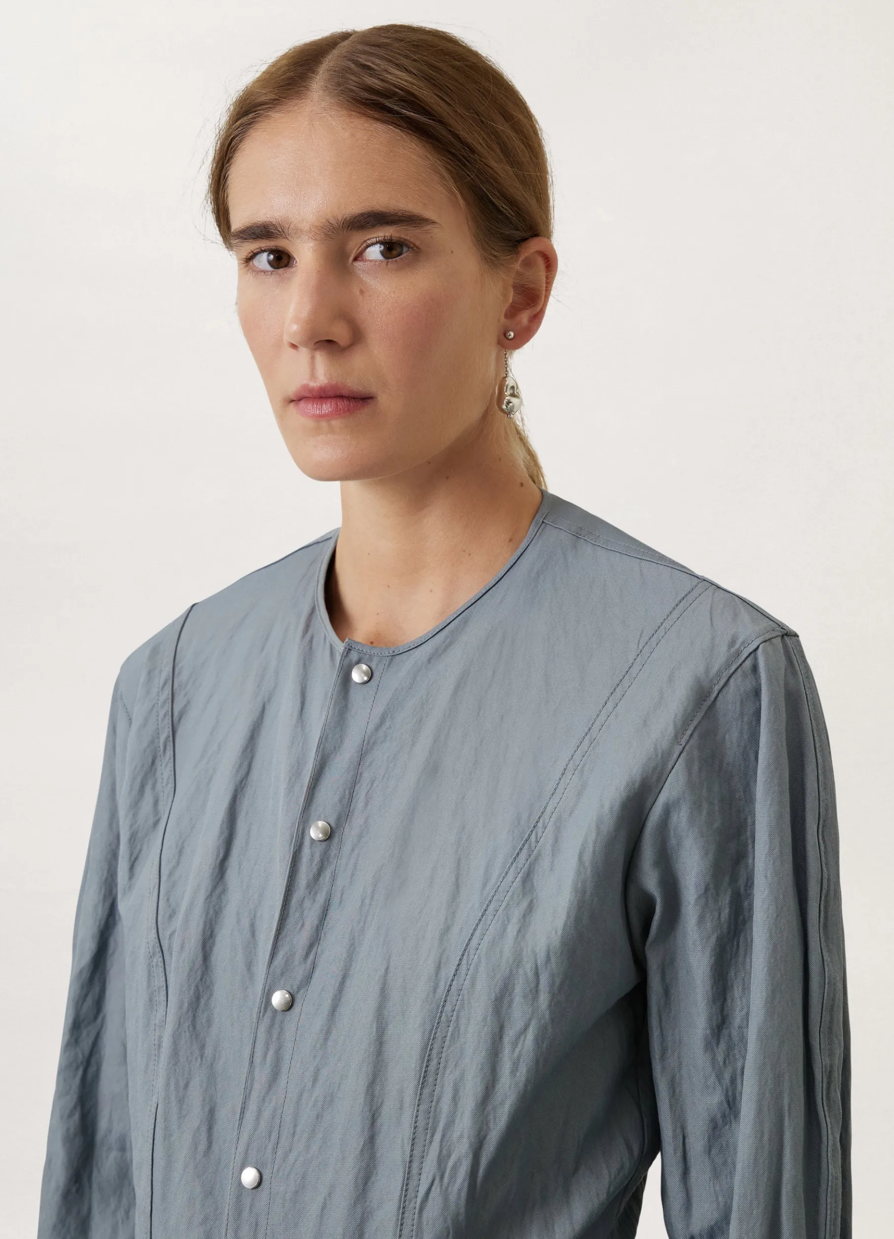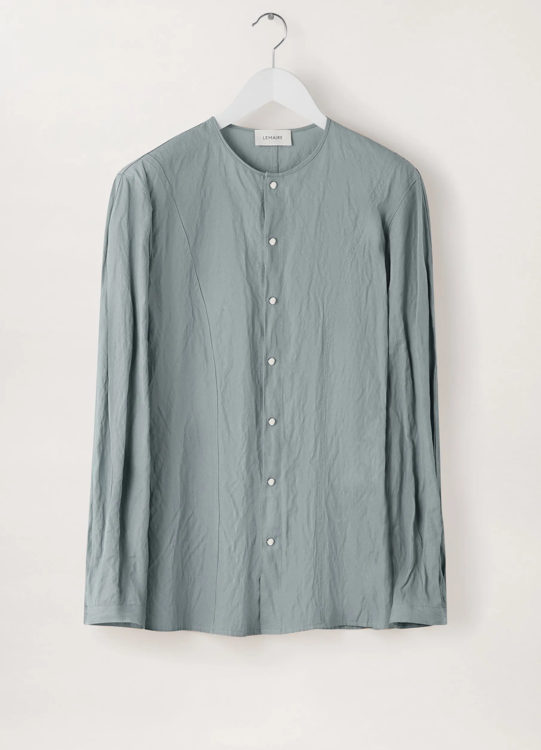 This Shirt Is Made Of A Cottonviscose Blend That Has Been Woven With Metal Yarn, Giving It A Permanently Crinkled Texture. Its Straight, Fitted Shape Is Structured By A Crewneck Collar And Princess Darts. Other Details Include Small Snapbuttoned Cuffs And Twin Stitching.
