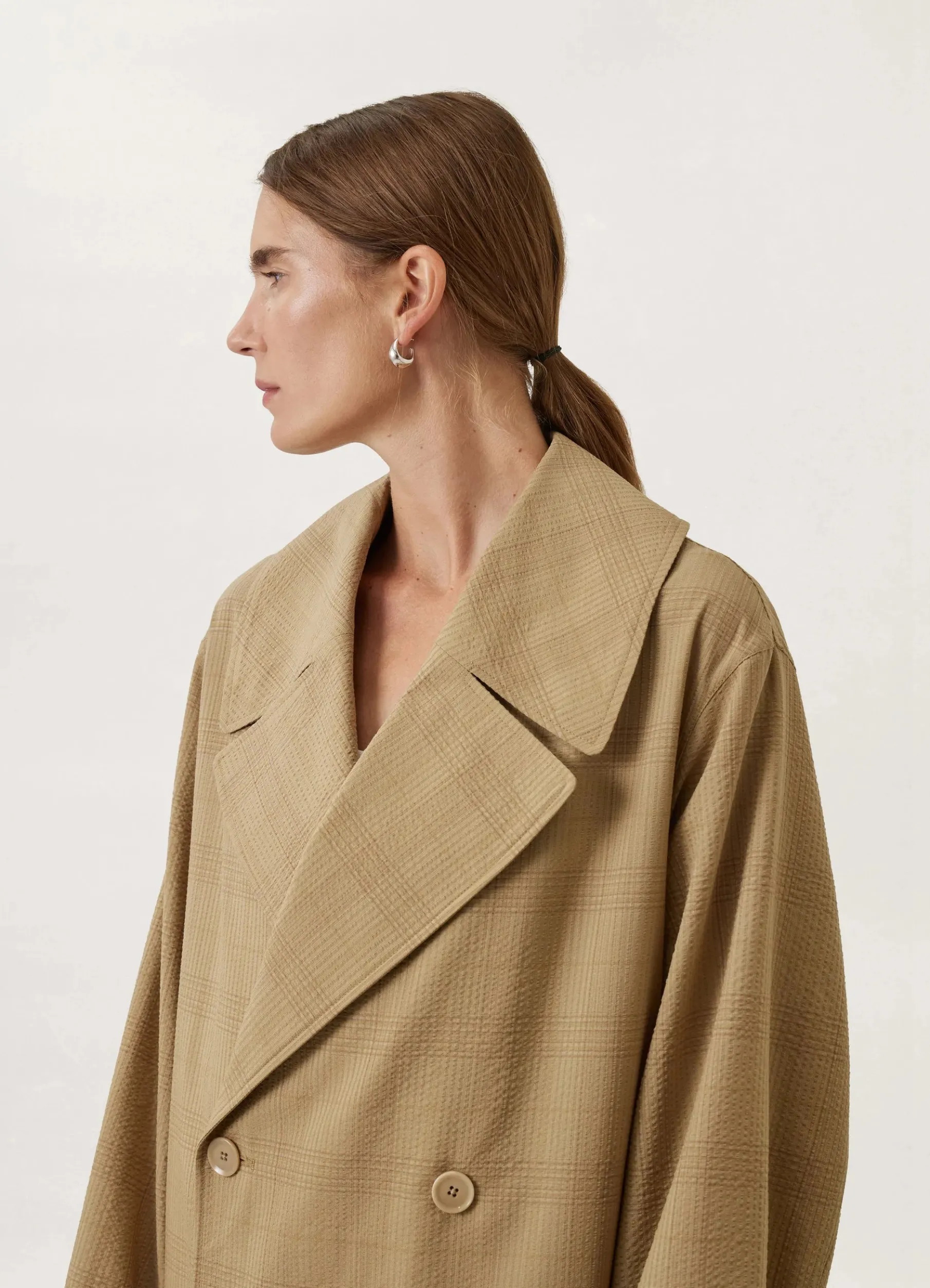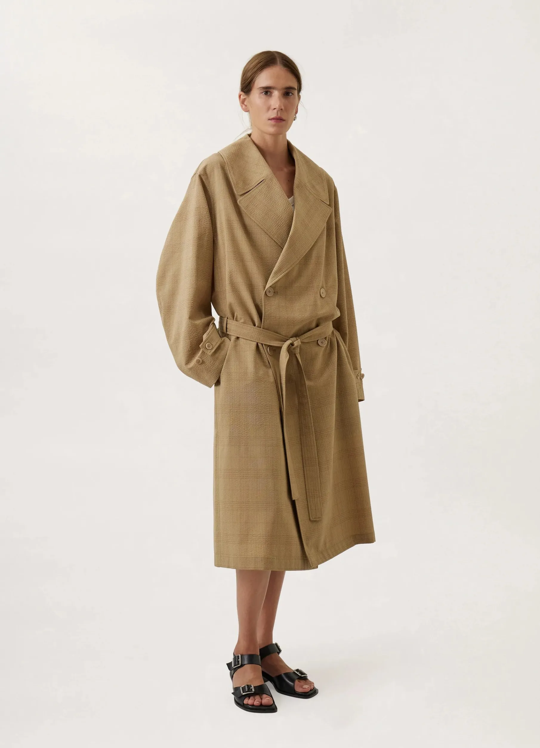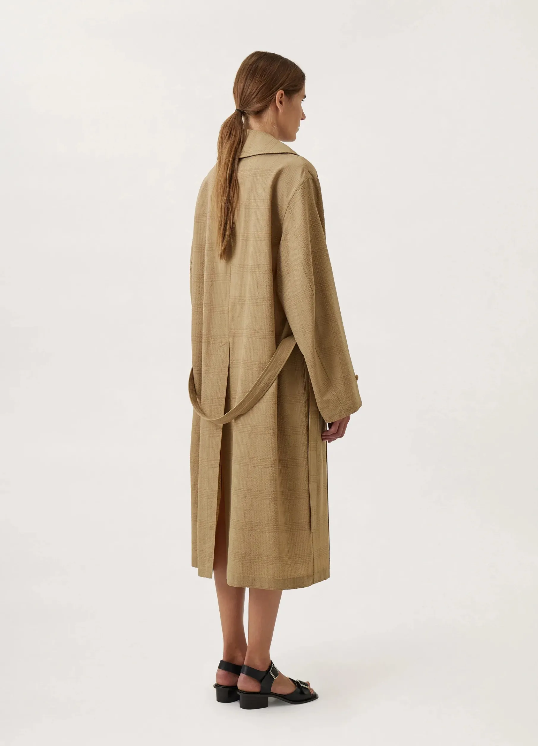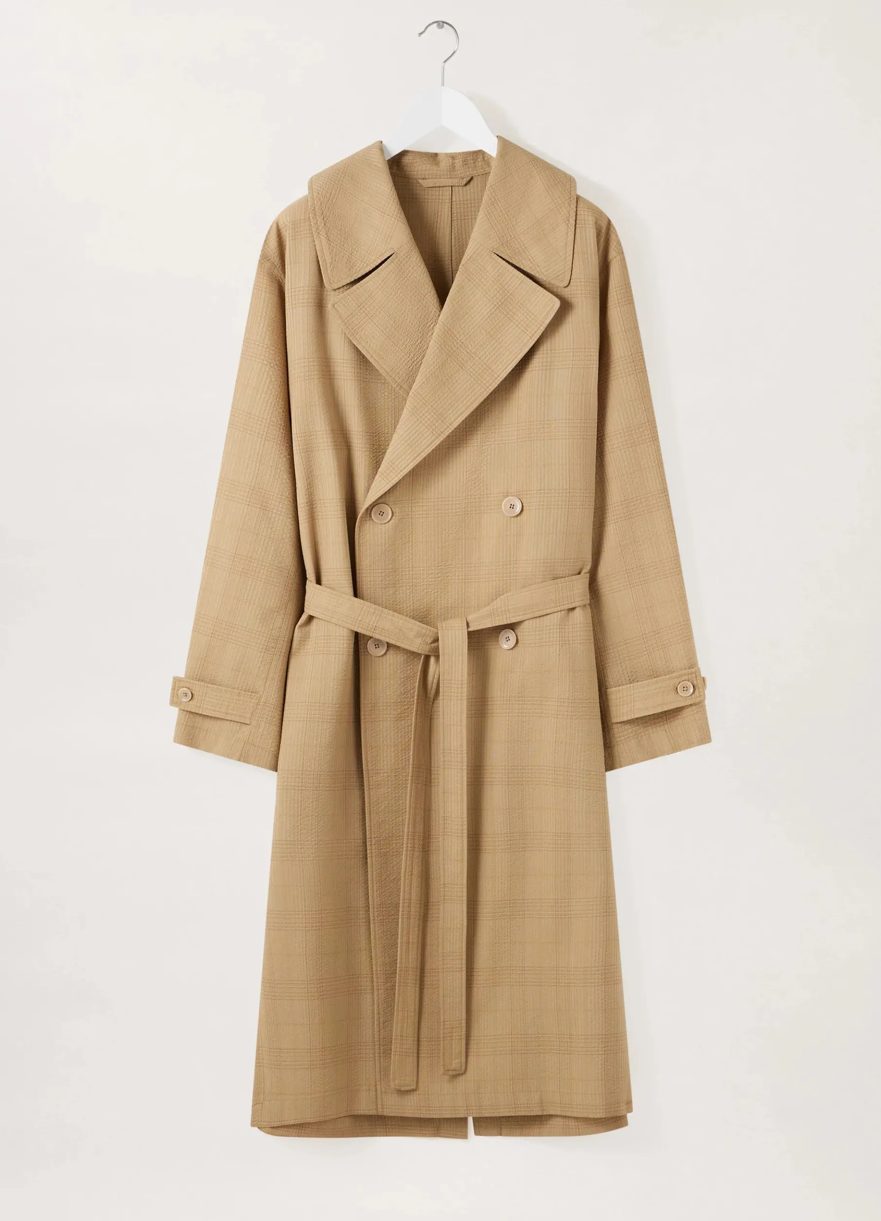 This Overcoat Is Made Of Seersucker Wool With A Textured Check Motif And A Dry Hand. Its Loose, Doublebreasted Volume Is Unlined To Maintain Movement. Details Include An Oversized Notch Collar, Trench Pockets, A Removable Belt And A Long Vent In The Back.
