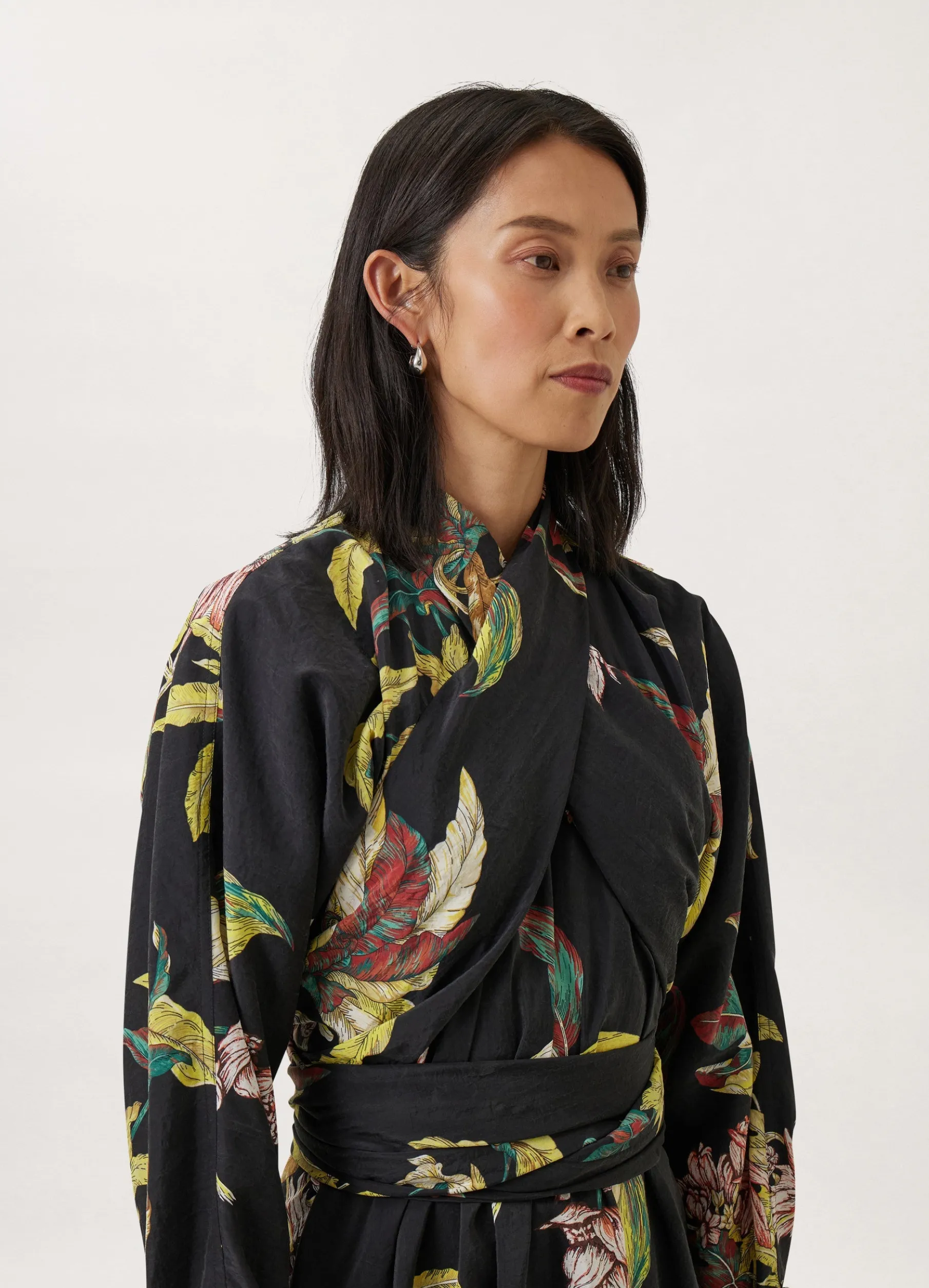 This Dress Is Made Of Dry Silk, A Classic Lemaire Fabric With A Soft Hand And Tonic Texture That Has Been Printed With A Bloom Of Tropical Flowers. This Adjustable Shape Features Crossed Front Panels That Evoke A Halterneck Sarong And Extend Into A Long Belt That Can Be Knotted In Multiple Ways. Other Details Include Kimono Sleeves And A Buttoned Back.