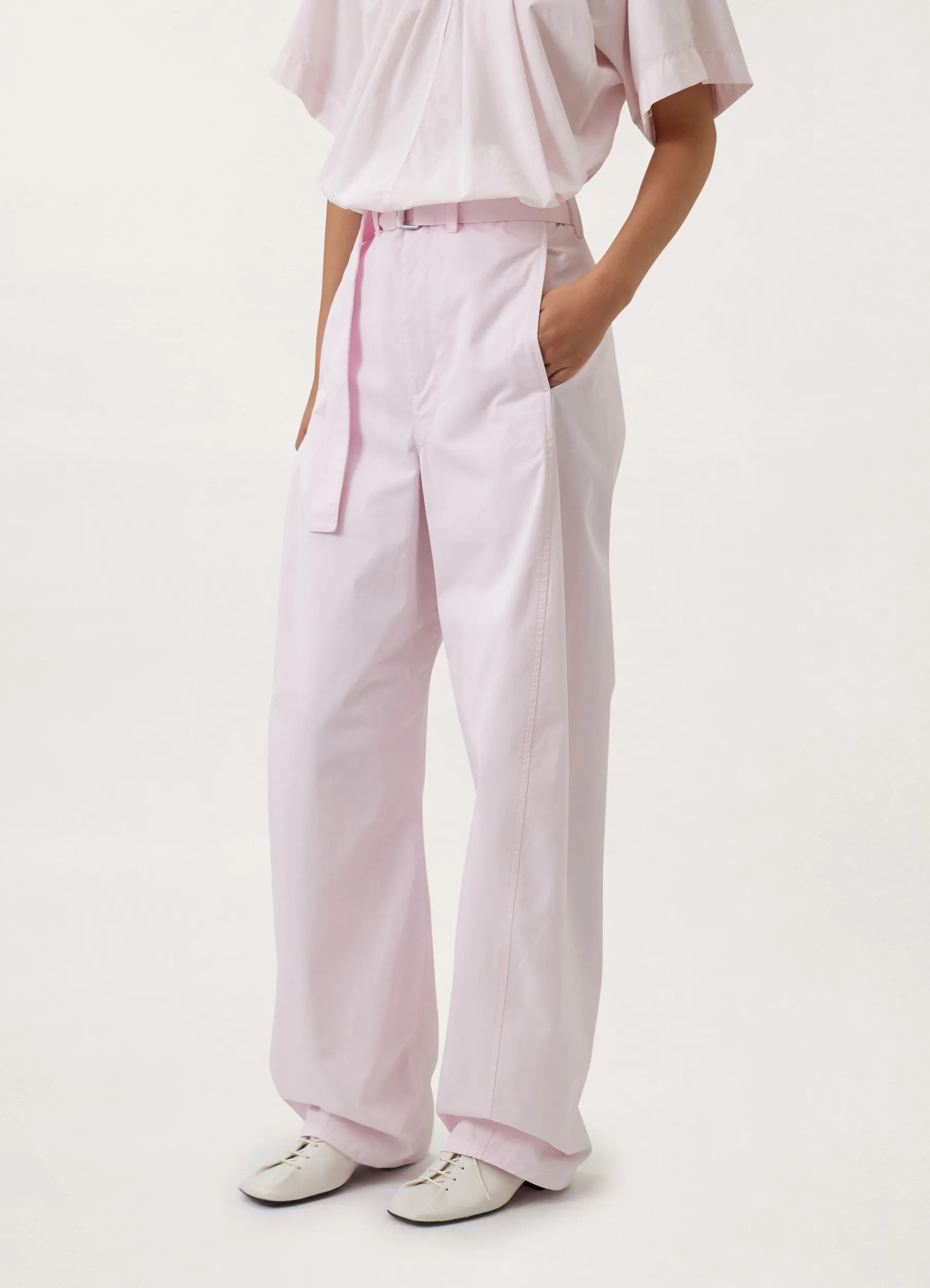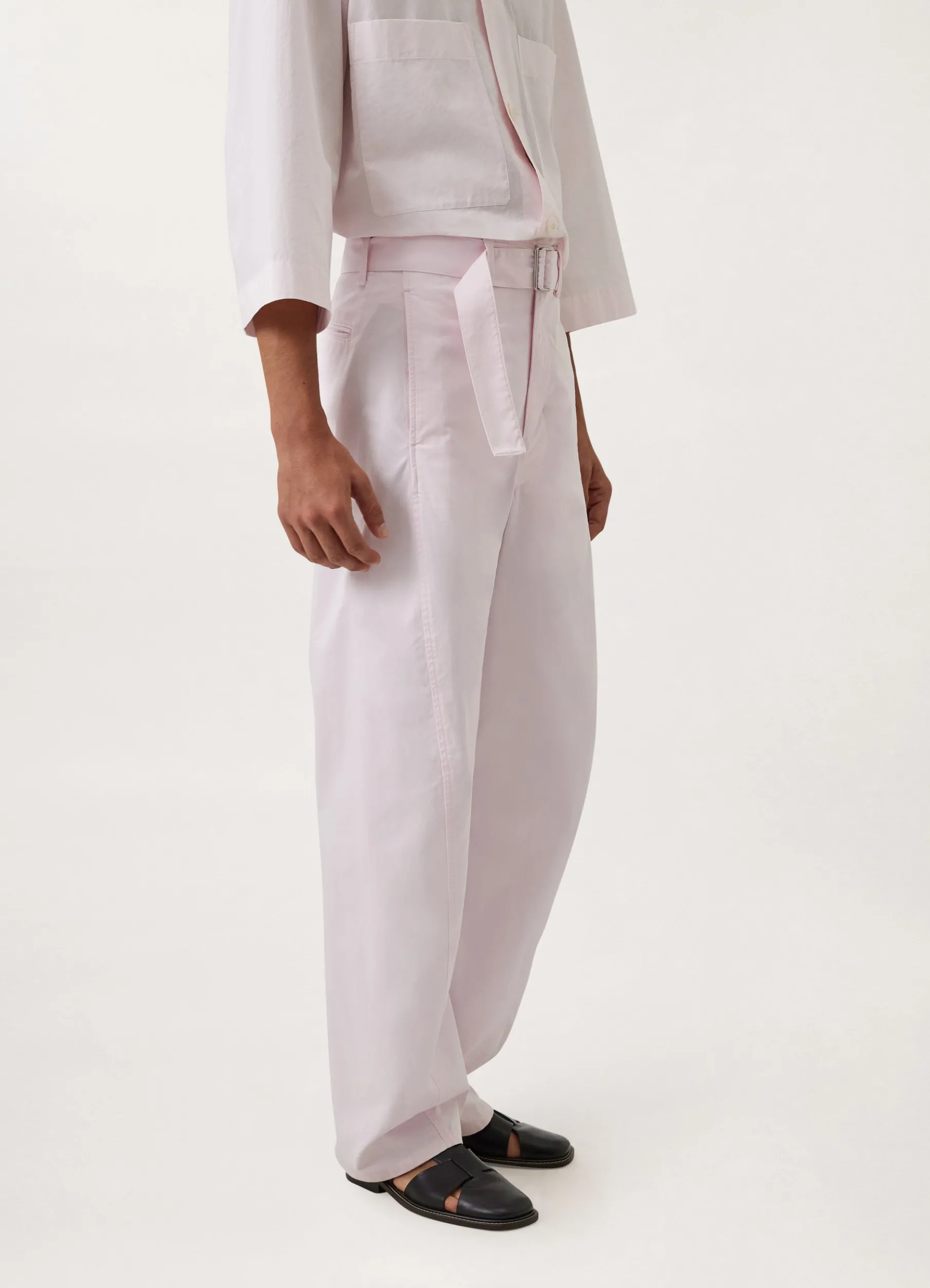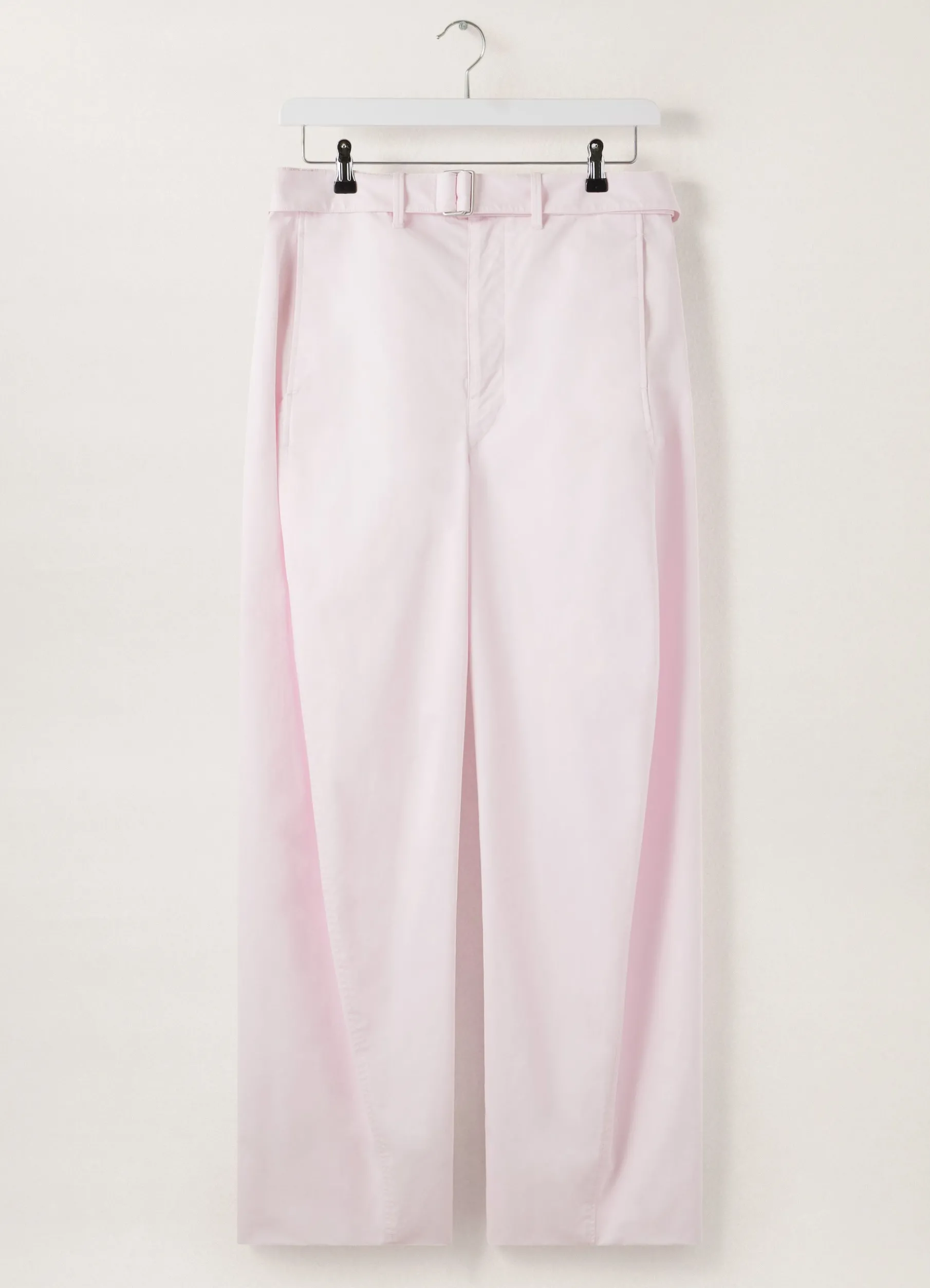 A New Addition To The Lemaire Twisted Family, These Unisex Pants Are Made From A Lightweight Cotton With A Visible Twill Weave. Their Sideseams Are Slightly Twisted Giving The Leg A Curved Shape. Details Include Two Side Pockets, A Jetted Pocket On The Back And Simple Topstitching. The Fit Is Elongated And Midrise, And Includes A Belt With Squared Edges To Adjust The Waist.