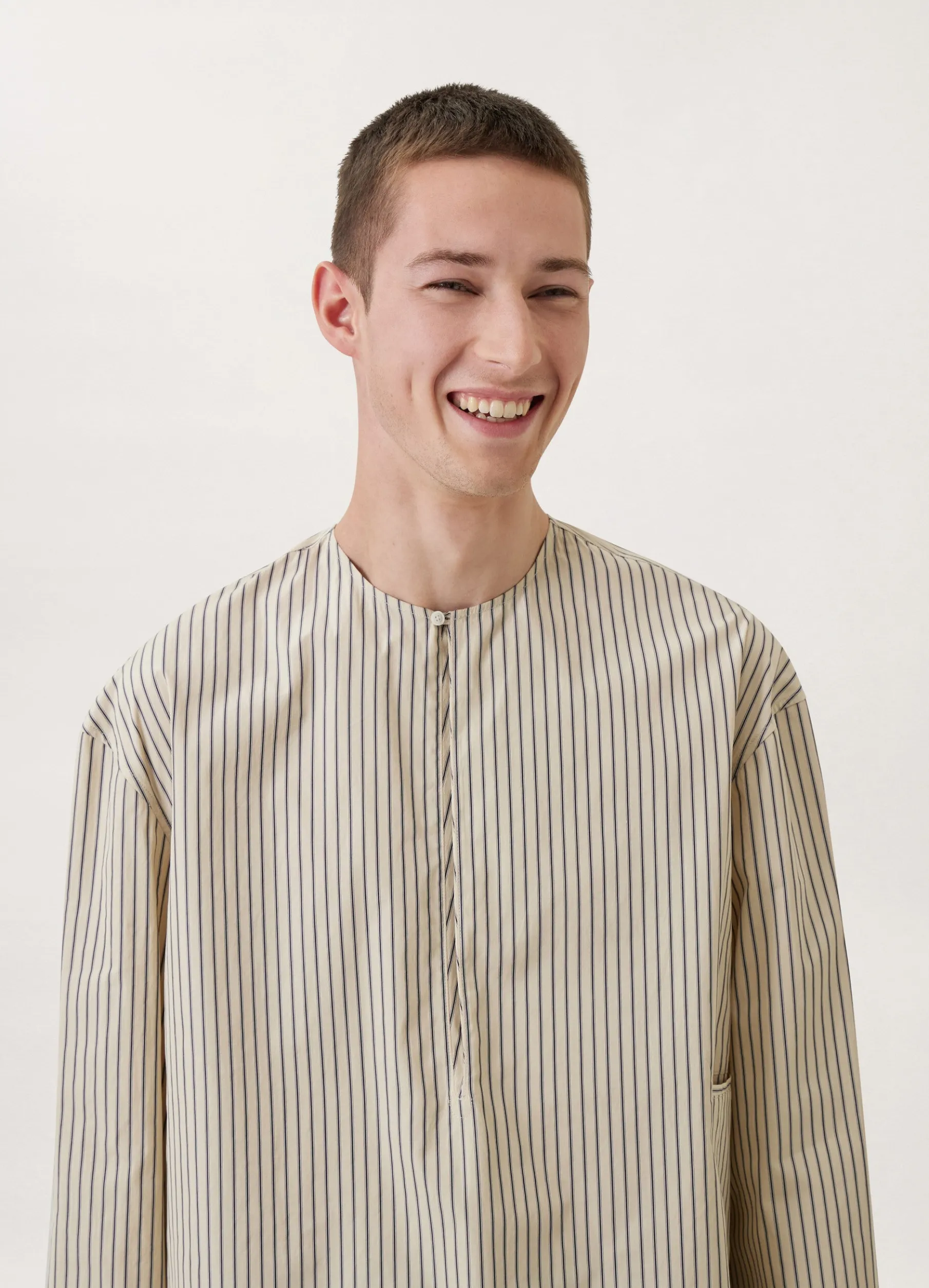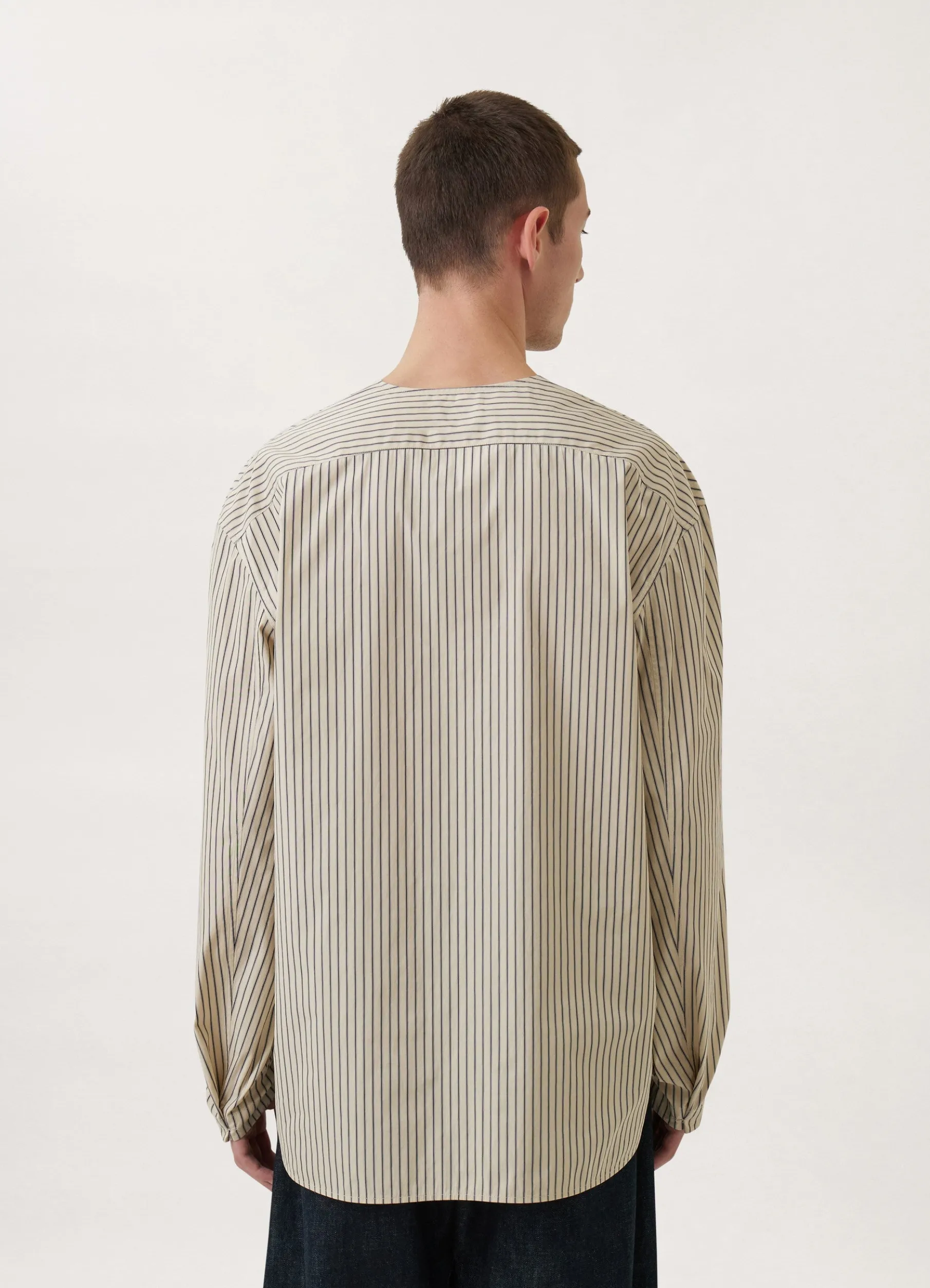 This Shirt Is Made Of A Classic Striped Poplin With A Shiny And Smooth Surface. Its Relaxed Fit Features Dropped Shoulder And A Gusseted Crewneck With A Single Button Loop Closure That Can Be Left Open For A Draped Effect. It Has Dshaped Stitching At The Bottom Of The Gusset And A Horizontal Welt Pocket On One Side. Other Details Include Two Small Buttons On The Sleeves That Can Be Utilized To Create An Adjustable Pleat, A Slightly Rounded Hem That Is Open On Both Sides, And A Back Yoke.