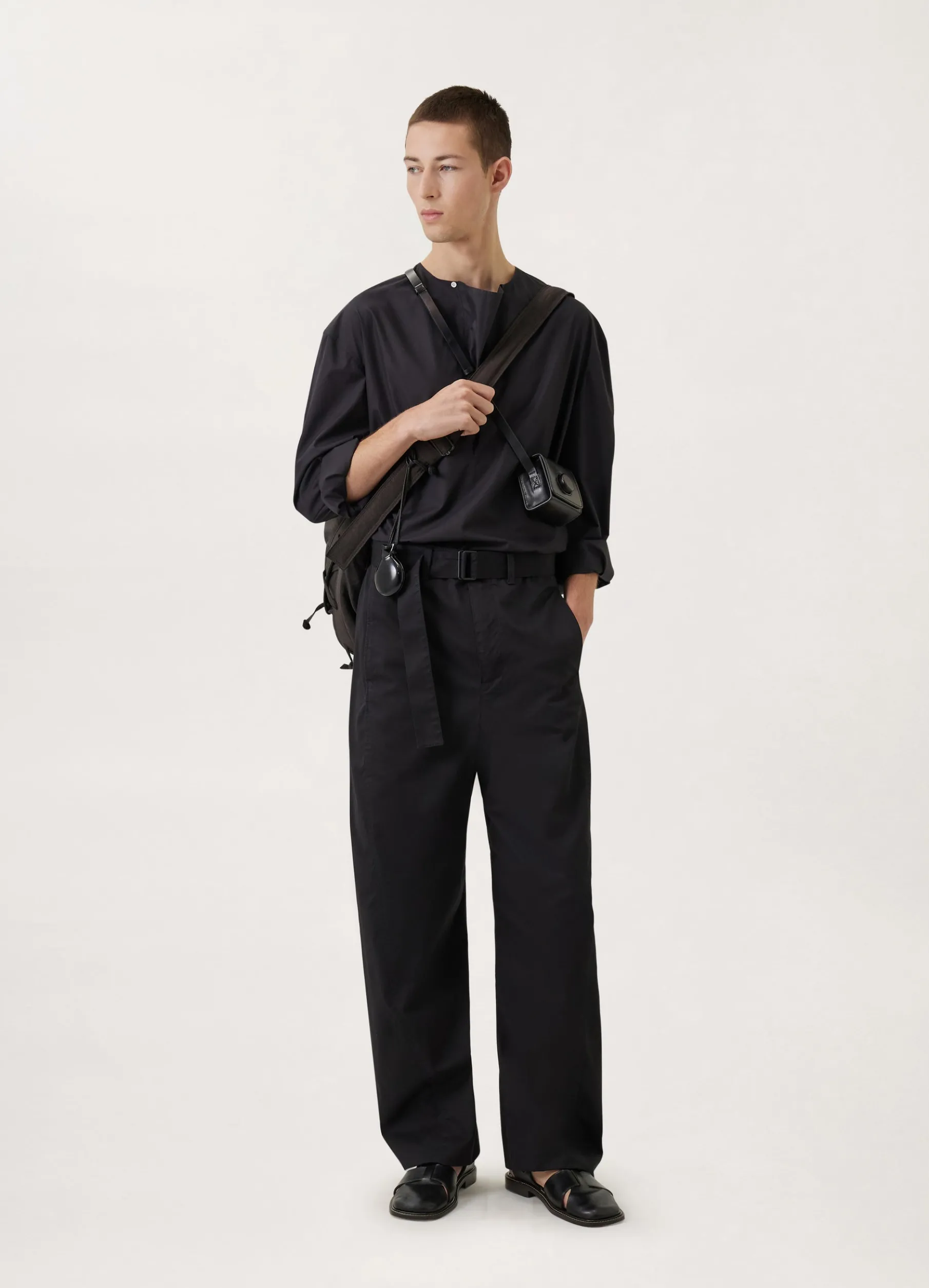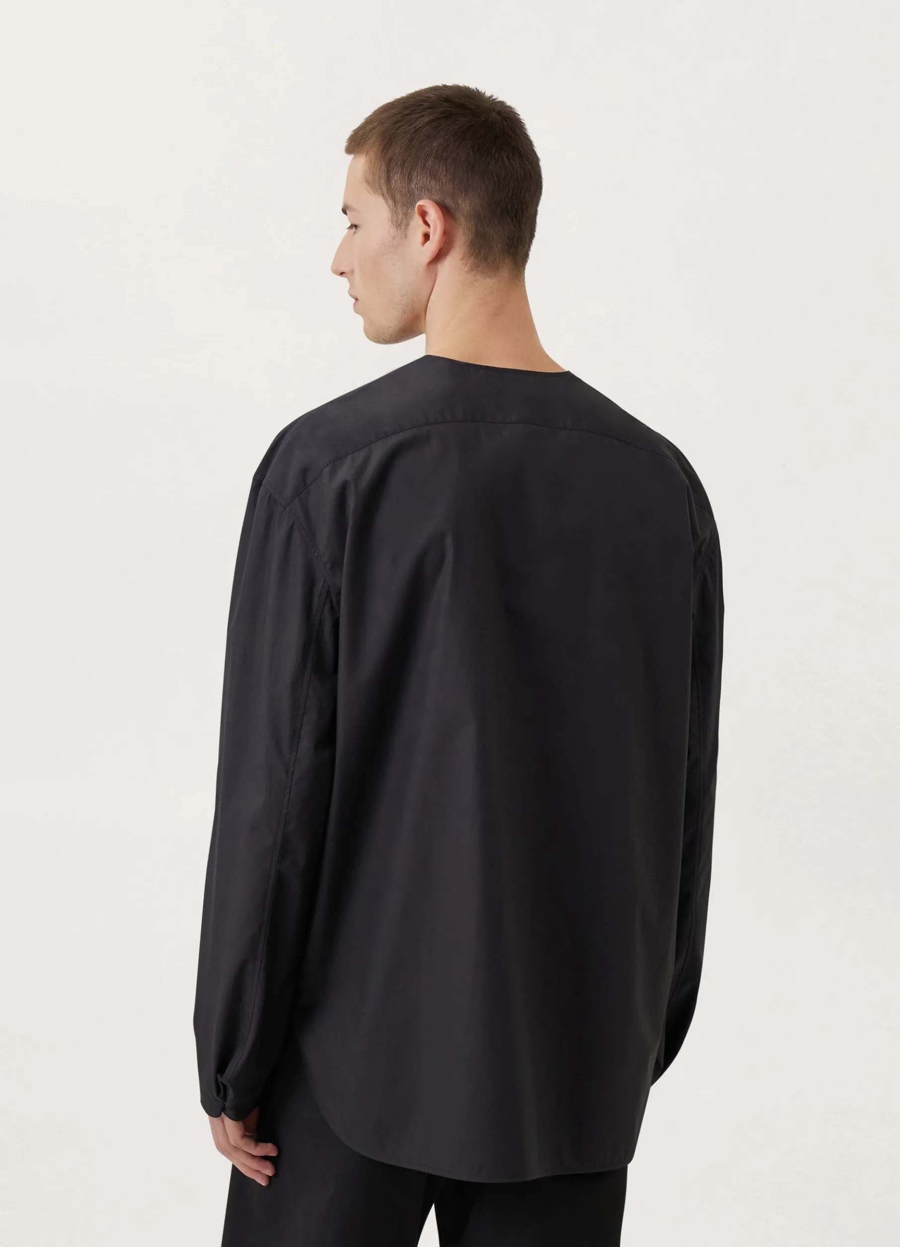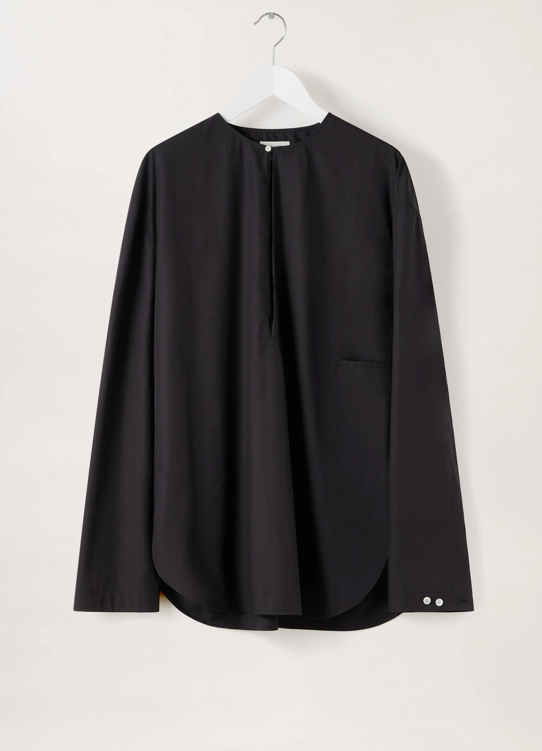 This Shirt Is Made Of A Cotton Poplin That Is Lightweight With A Satinlike Finish. Its Relaxed Fit Features Dropped Shoulder And A Gusseted Crewneck With A Single Button Loop Closure That Can Be Left Open For A Draped Effect. It Has Dshaped Stitching At The Bottom Of The Gusset And A Horizontal Welt Pocket On One Side. Other Details Include Two Small Buttons On The Sleeves That Can Be Utilized To Create An Adjustable Pleat, A Slightly Rounded Hem That Is Open On Both Sides, And A Back Yoke.