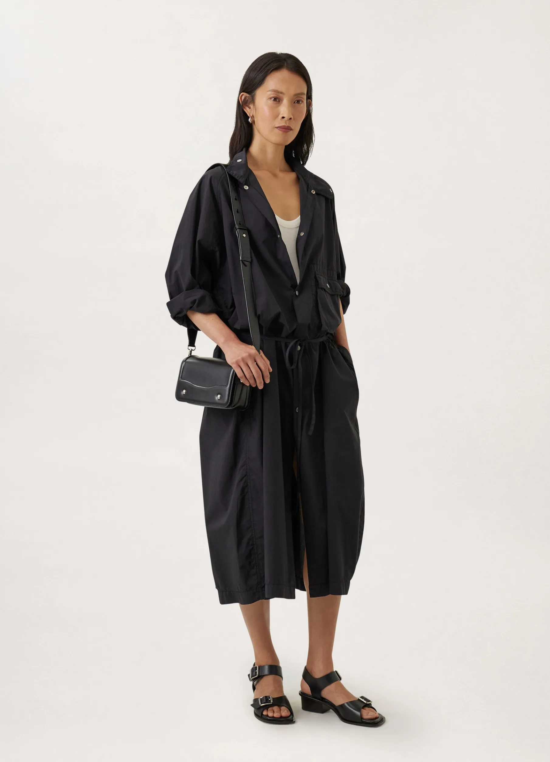 This Dress Is Made Of Airy Cotton That Has Been Garment Dyed, Softening Its Hand. Its Rounded Volume Is Slightly Tapered At The Hem And Features A Stand Collar, Dropped Shoulders And Wide Raglan Sleeves. Military Inspired Details Include A Gusseted And Reinforced Pocket And A Thin Selffabric Belt To Tie In The Waistline.