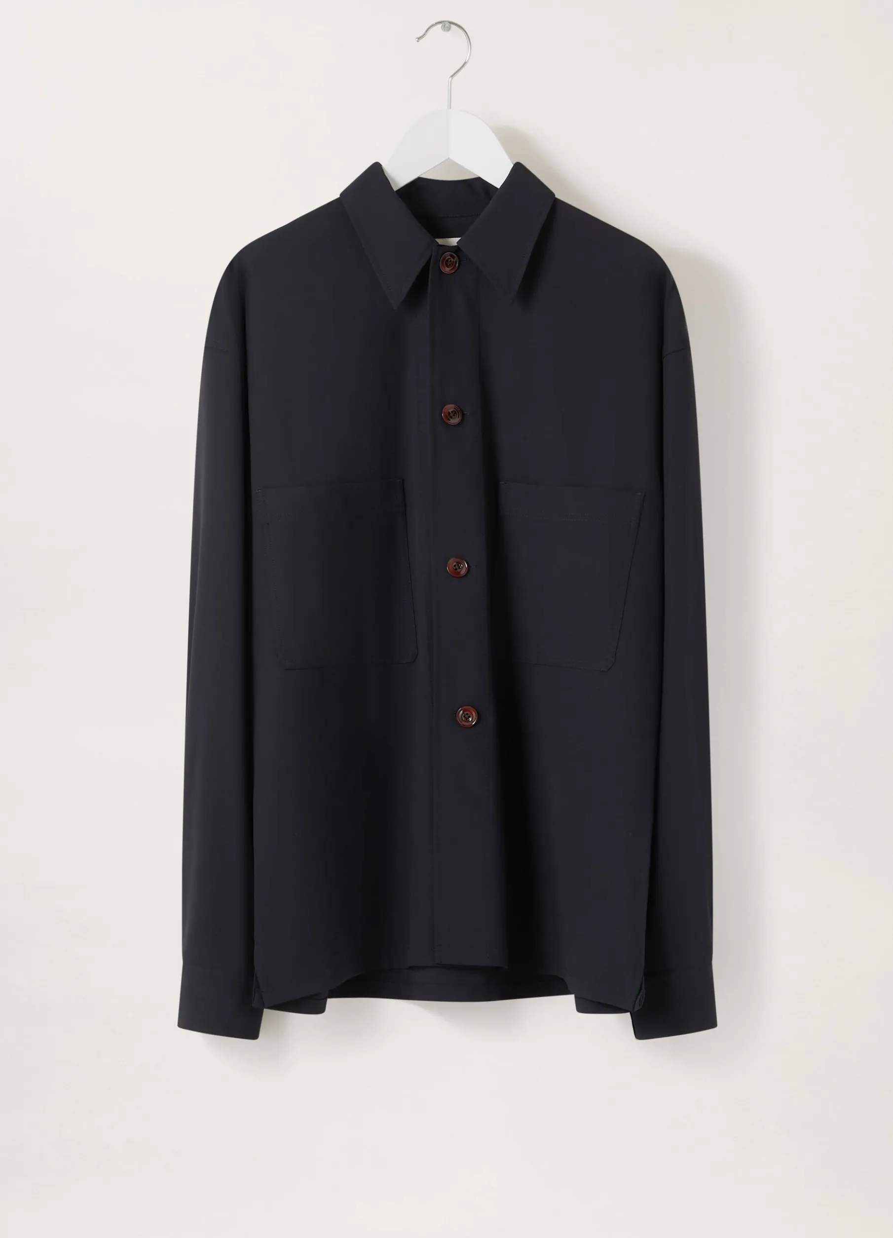 This Shirt Is Made Of A Light Wool Gabardine With A Soft Hand And A Fluid Drape. The Fit Is Boxy With Classic Pyjama Details Such As A Convertible Collar, Two Chest Patch Pockets, And A Straight Hem With Side Slits. It Has Straight Pleated Cuffs With Slightly Higher Slit Openings For A Deeper Fold.