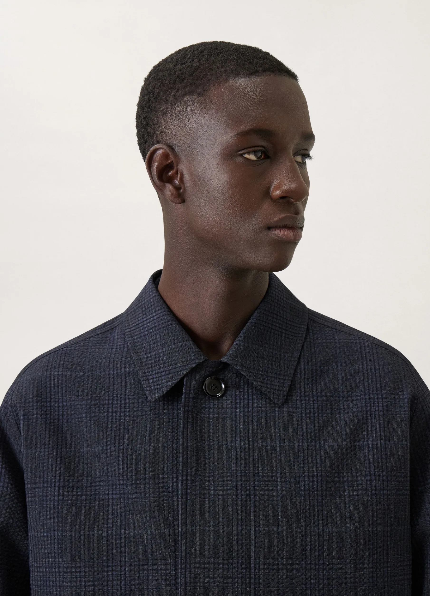 This Coat Is Made Of Seersucker Wool With A Textured Check Motif And A Dry Hand. It Has A Straight Silhouette With A Classic Collar And Soft Shoulders That Extend Into Raglan Sleeves. This Piece Features A Fully Concealed Button Placket Aside From A Single Button Visible Just Beneath The Collar And A Back Vent That Can Be Buttoned. Two Large Jetted Pockets And Two Interior Pockets Finish Its Details.
