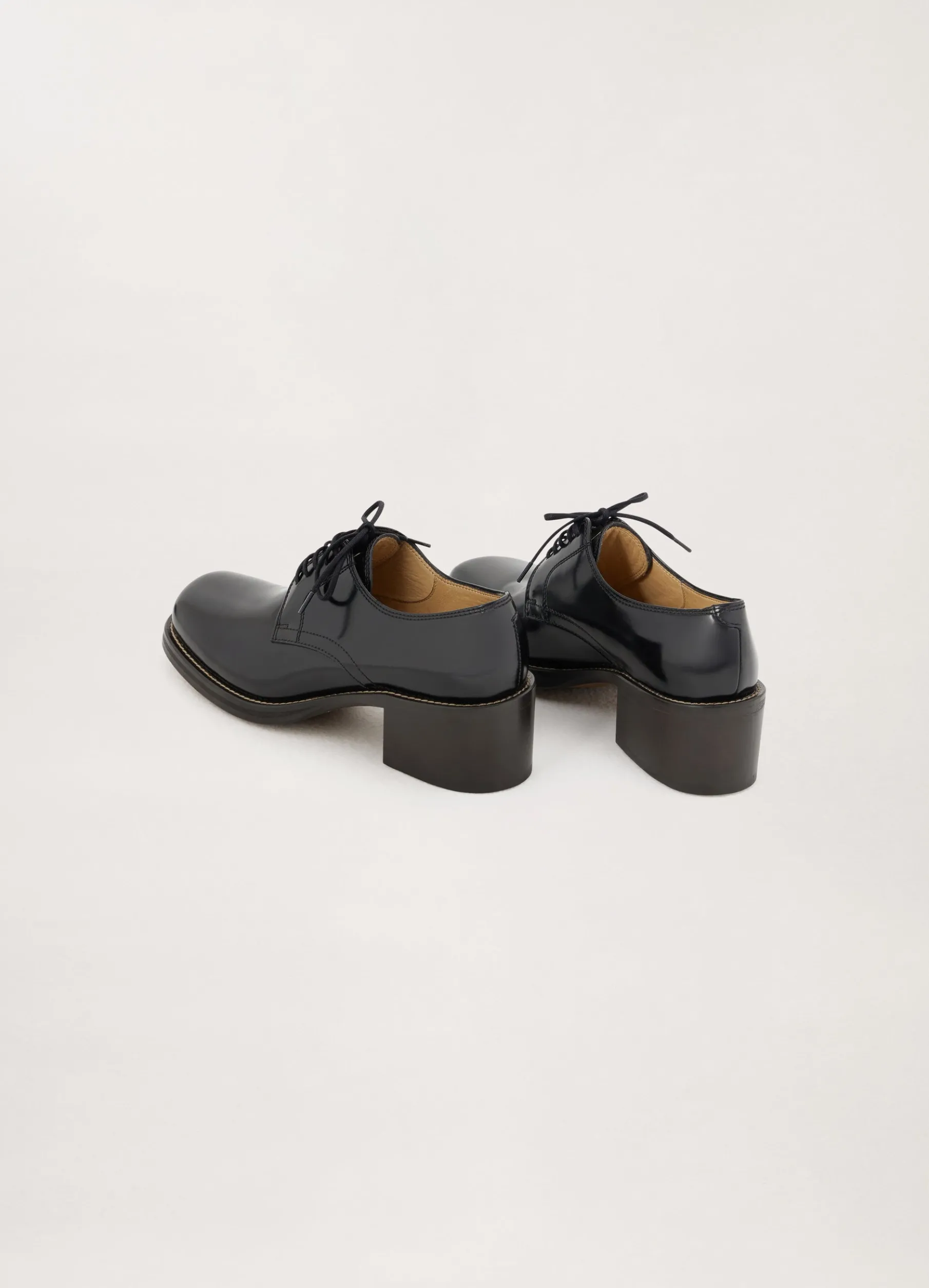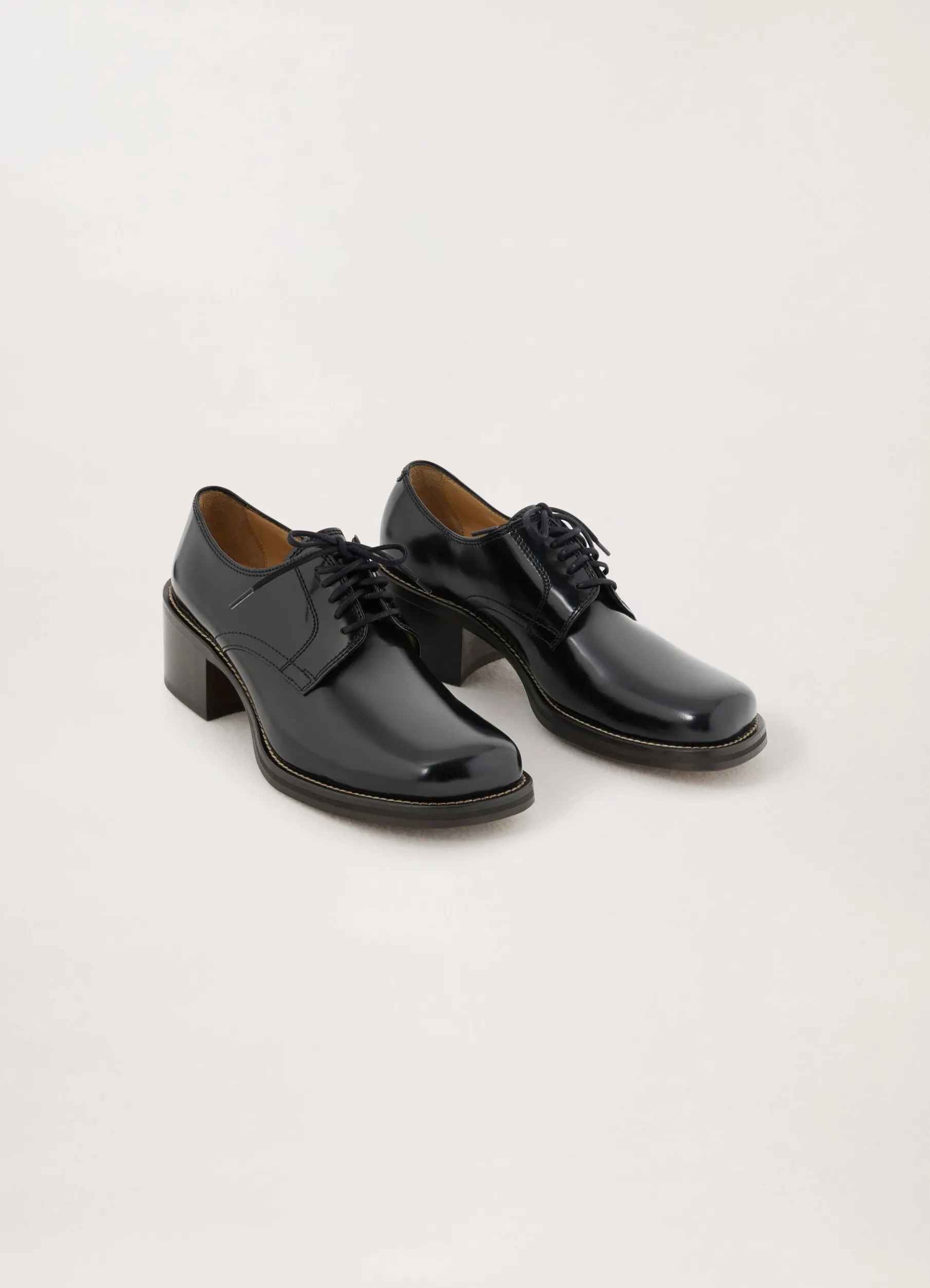 These Laced Derbies Are Made Of Structured Leather With A Smooth, Shiny Surface. Their Heeled Shape Features A Molded Squaretoed Vamp And Square Stacked Leather Heels.
