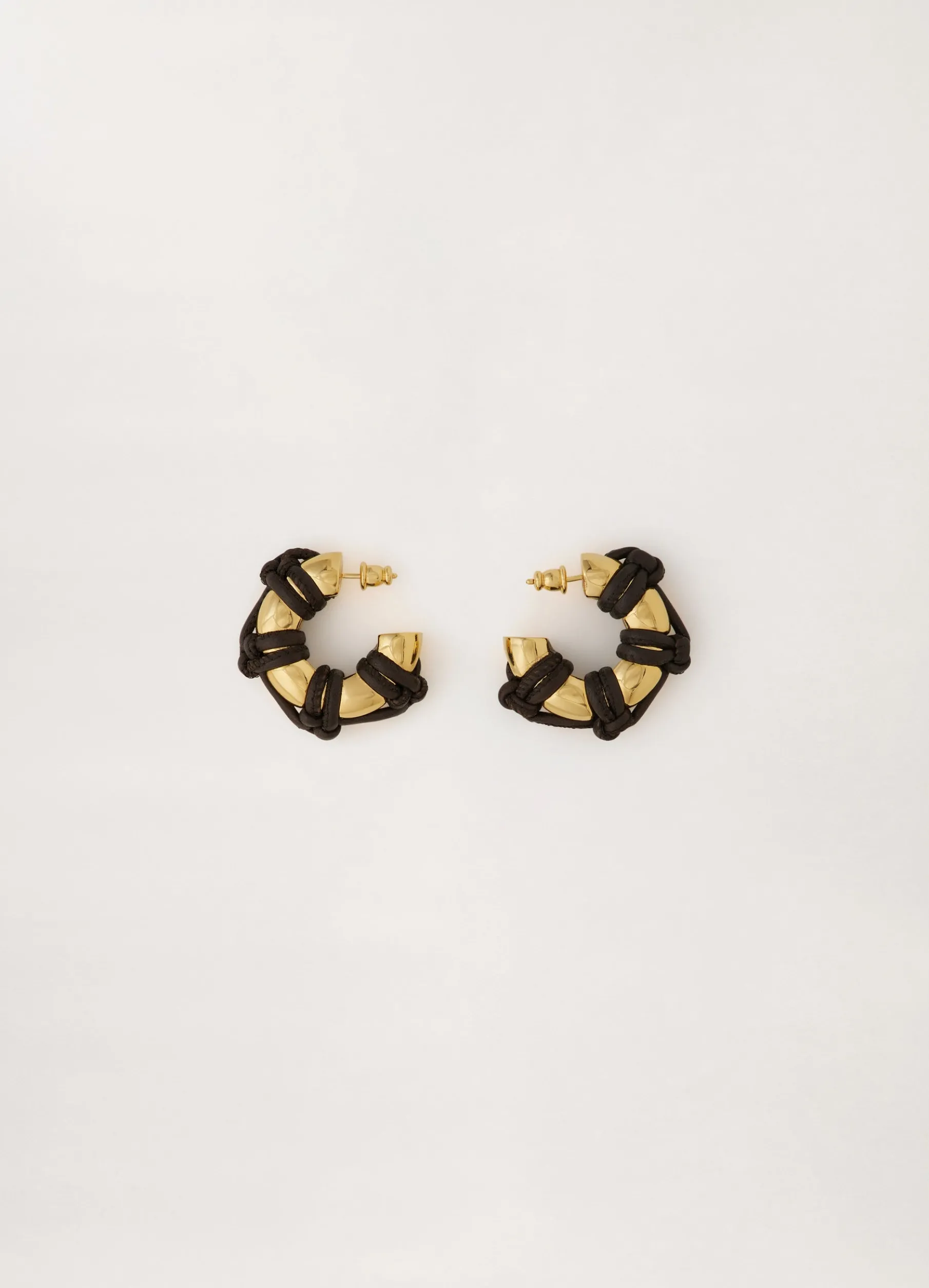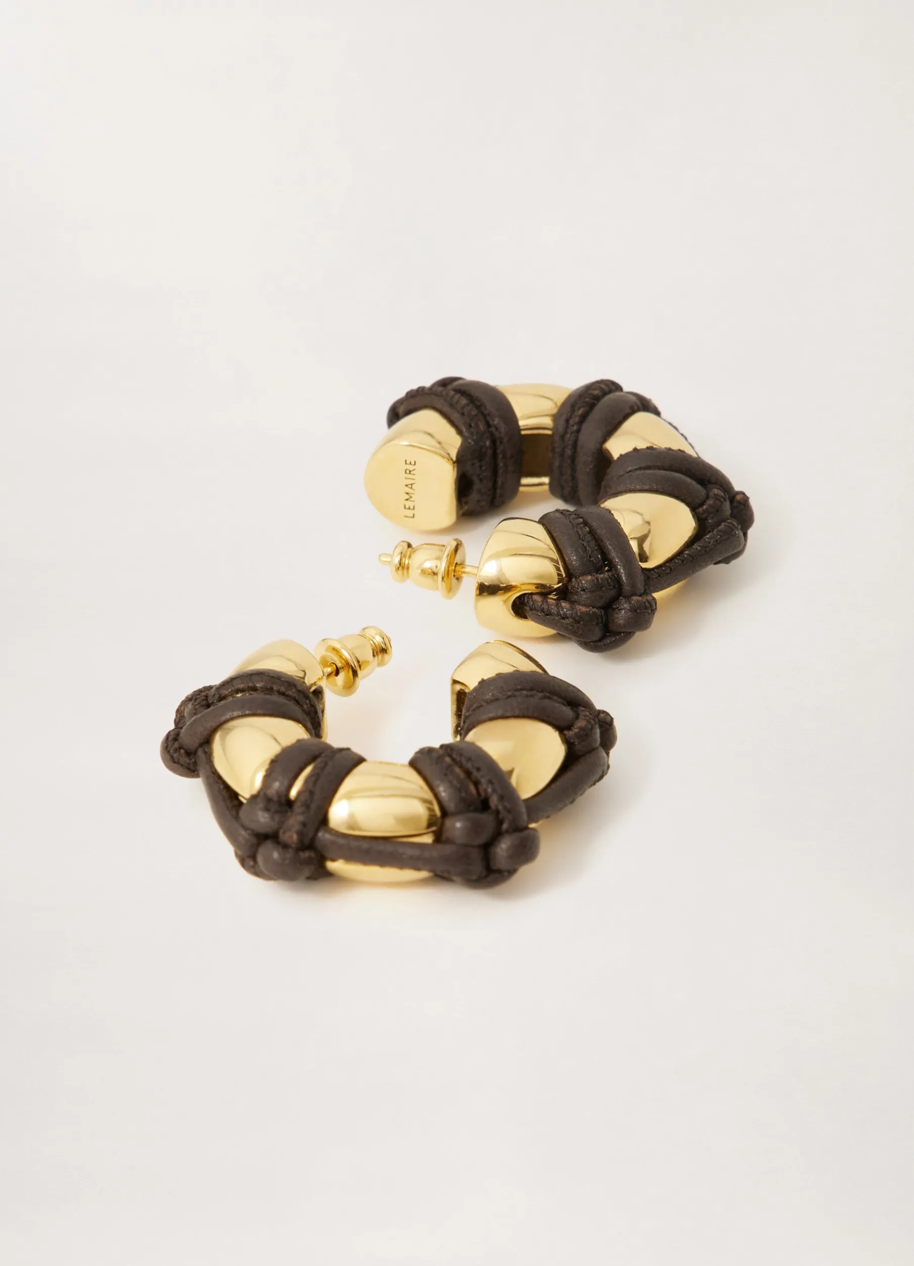 These Hoops Are Made Of Brass With An Antique Bronze Or Light Gold Finish, And Nappa Leather Cords In Contrasting Tones. Inspired By The Ancient Japanese Knottying Technique Of Shibari, They Feature Leather Cords That Are Knotted Along The Tubular Volume Of The Hoops, Delicately Sculpting Their Hollow Shape.